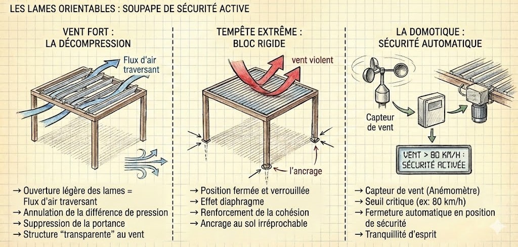 Contrairement à un toit fixe qui subit toute la pression, les lames orientables offrent une soupape de sécurité.
